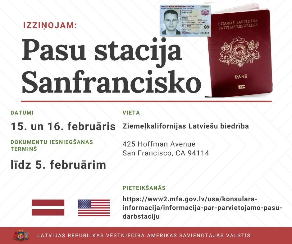 Latvijas Republikas vēstniecība Amerikas Savienotajās Valstīs izziņo pārvietojamās pasu stacijas izbraukumu 2023. gada 15. februārī un 16. februārī, Sanfrancisko, Kalifornijā.